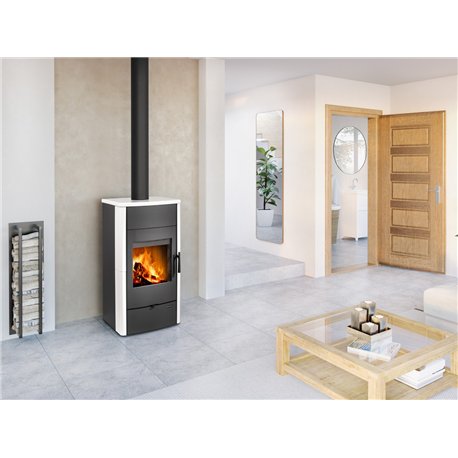 Teplovodní krbová kamna jsou vhodná pro nízkoenergetické domy díky dvěma sklům ve dveřích kamen. Účinný teplovodní výměník o objemu 28l dokáže přenést do vody 70% energie a 30% do vzduchu. Inovativní systém vedení spalin DOUBLE SPIN zvyšuje účinnost kamen. Kamna disponují systémem CPV – centrální přívod externího vzduchu. Ve standardu je možné zapojení horního odvodu spalin. Díky sekundárnímu přívodu vzduchu je sklo dvířek omýváno, a tak nedochází k usazování nečistot. Spalovací komora je vyložena šamotovými tvarovkami. Regulaci primárního a sekundárního přívodu vzduchu lze řídit jediným ovládacím prvkem. Ve spodní části kamen je uzavíratelný dřevník, který umožnuje uskladnění menší zásoby dřeva nebo krbového nářadí. Kamna jsou vybavena vychlazovací smyčkou proti přetopení výměníku.