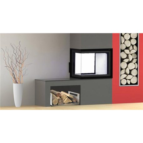 - Průhledová krbová vložka, oboje dveře s otevíráním do strany, jedny v rohovém provedení (jednodílné ohýbané sklo)