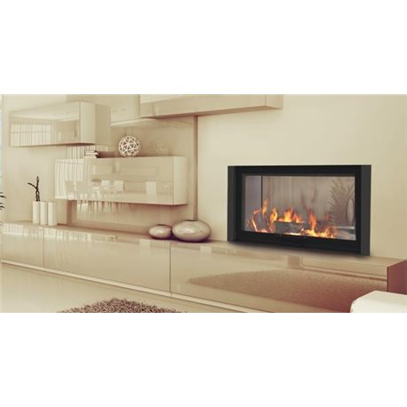 • Průhledová krbová vložka s širokoúhlým prosklením, jedny dveře otvíravé do strany, druhé výsuvné nahoru