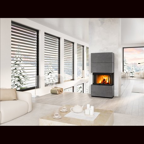 Krby řady CARA jsou obloženy velkoplošným přírodním kamenem nebo povrchově upraveným plechem. Odstínění zadního pláště je umožňuje umístit přímo ke stěně.